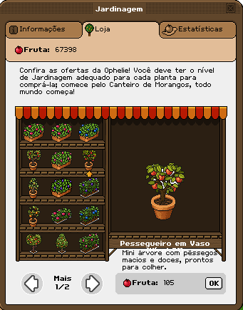 Para plantar, basta você abrir a Loja (no mesmo BOT "Ophelie") que está ao lado esquerdo das "Estatísticas" e comprar a respectiva planta de acordo com a quantidade de "Frutas" que você possui! Ressalva-se, as frutas, são como uma "moeda" da jardinagem e podem ser conseguidas plantando, tal como você só consegue comprar a fruta respectiva de seu nível!