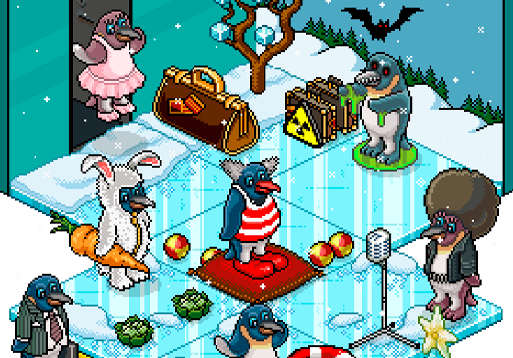 Os clássicos Pinguins estão pousando no Habbo Origins com uma caça diária por essas aves queridas. Todos os dias, um bot num Espaço Público disponibiliza um novo Pinguim para troca.