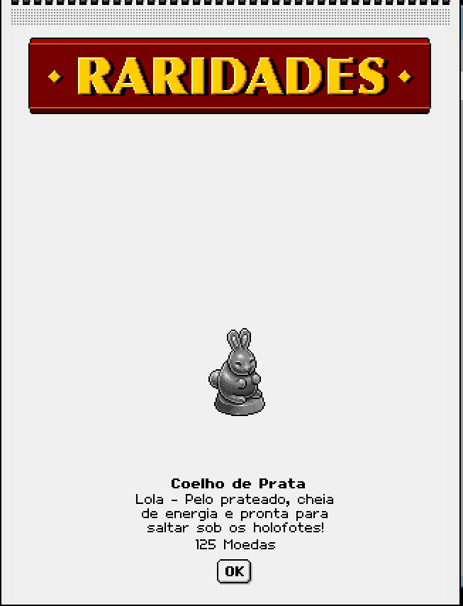 Nas noites de lua cheia, dizem que o Coelho de Prata aparece em quartos silenciosos, deixando brilhos prateados no chão. Não há magia oficial só a lenda dos jogadores, que acreditam: quem o tem, tem sorte. Um raro encanto, feito de pixels e imaginação.